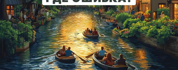 Пред вас има снимка, на която е изобразен красив пейзаж на вечерен град. Между къщите тече река, по която плуват хора в лодки. На пръв поглед изображението изглежда нормално, но в действителност в него има груба грешка.